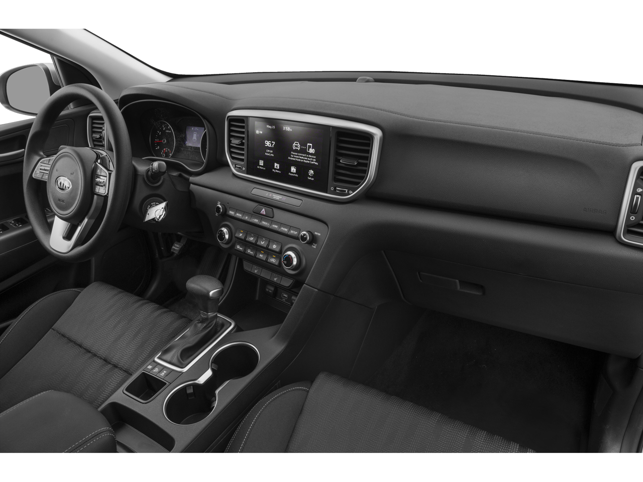 This 2021 Snow White Pearl Kia Sportage LX AWD is well equipped and includes these features and benefits: AWD, 17 Machine-Finished Alloy Wheels, 4-Wheel Disc Brakes, 6 Speakers, 6-Way Manual Driver's Seat, ABS brakes, Air Conditioning, Alloy wheels, AM/FM radio, Apple CarPlay & Android Auto, Auto High-beam Headlights, Axle Ratio: 3.195, Brake assist, Bumpers: body-color, Carpet Floor Mats, Cloth Seat Trim, Delay-off headlights, Driver door bin, Driver vanity mirror, Dual front impact airbags, Dual front side impact airbags, Electronic Stability Control, Exterior Parking Camera Rear, Four wheel independent suspension, Front anti-roll bar, Front Bucket Seats, Front Center Armrest, Front fog lights, Front reading lights, Fully automatic headlights, Illuminated entry, Low tire pressure warning, Occupant sensing airbag, Outside temperature display, Overhead airbag, Overhead console, Panic alarm, Passenger door bin, Passenger vanity mirror, Power door mirrors, Power steering, Power windows, Radio: AM/FM Audio System, Rear anti-roll bar, Rear seat center armrest, Rear window defroster, Rear window wiper, Remote keyless entry, Security system, Speed control, Speed-sensing steering, Split folding rear seat, Spoiler, Steering wheel mounted audio controls, Tachometer, Telescoping steering wheel, Tilt steering wheel, Traction control, Trip computer, and Variably intermittent wipers.